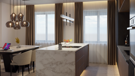 – Maßgeschneiderte Küche mit monolithischer Insel und integrierter Beleuchtung